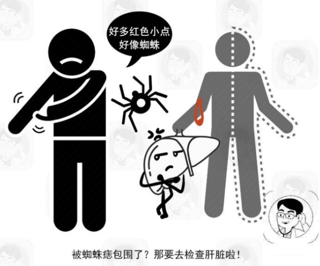 肝硬化会造成肝功能不断下降,无法完成雌激素的灭活和平衡工作,大量雌激素在体内堆积促使微动脉血管病变,从而在患者颈部、胸部、四肢等部位形成扩张,周围还会向着四周出现类似蜘蛛脚一般的分支,表面呈鲜红色,临床上将其称为“蜘蛛痣”。